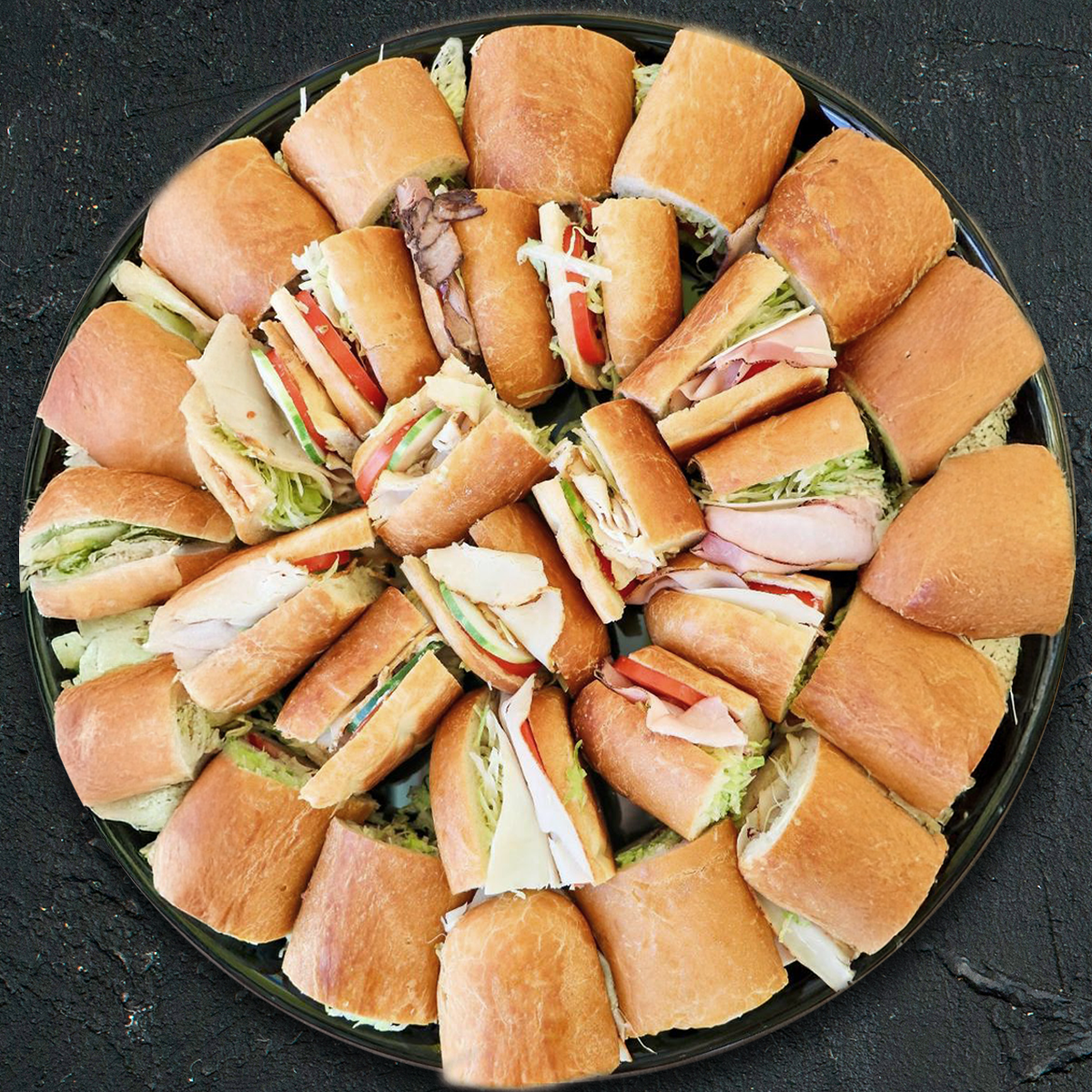 A selection of baguette sandwiches made with a selection of the following fillings: Pesto & mozzarella, Tikka chicken and Egg Mayonnaise.