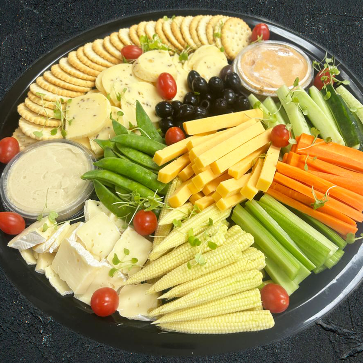 The platter is made up of a selection of snack sized halloumi wraps and vegan friendly falafels both filled with carrot, lettuce and tomato.