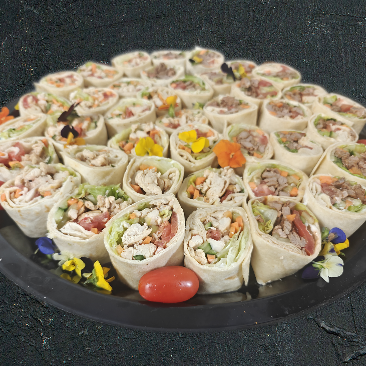 Snack sized wraps filled with chicken breast drizzled with a yoghurt based sauce, and garnished with carrot, tomato and lettuce fillings.