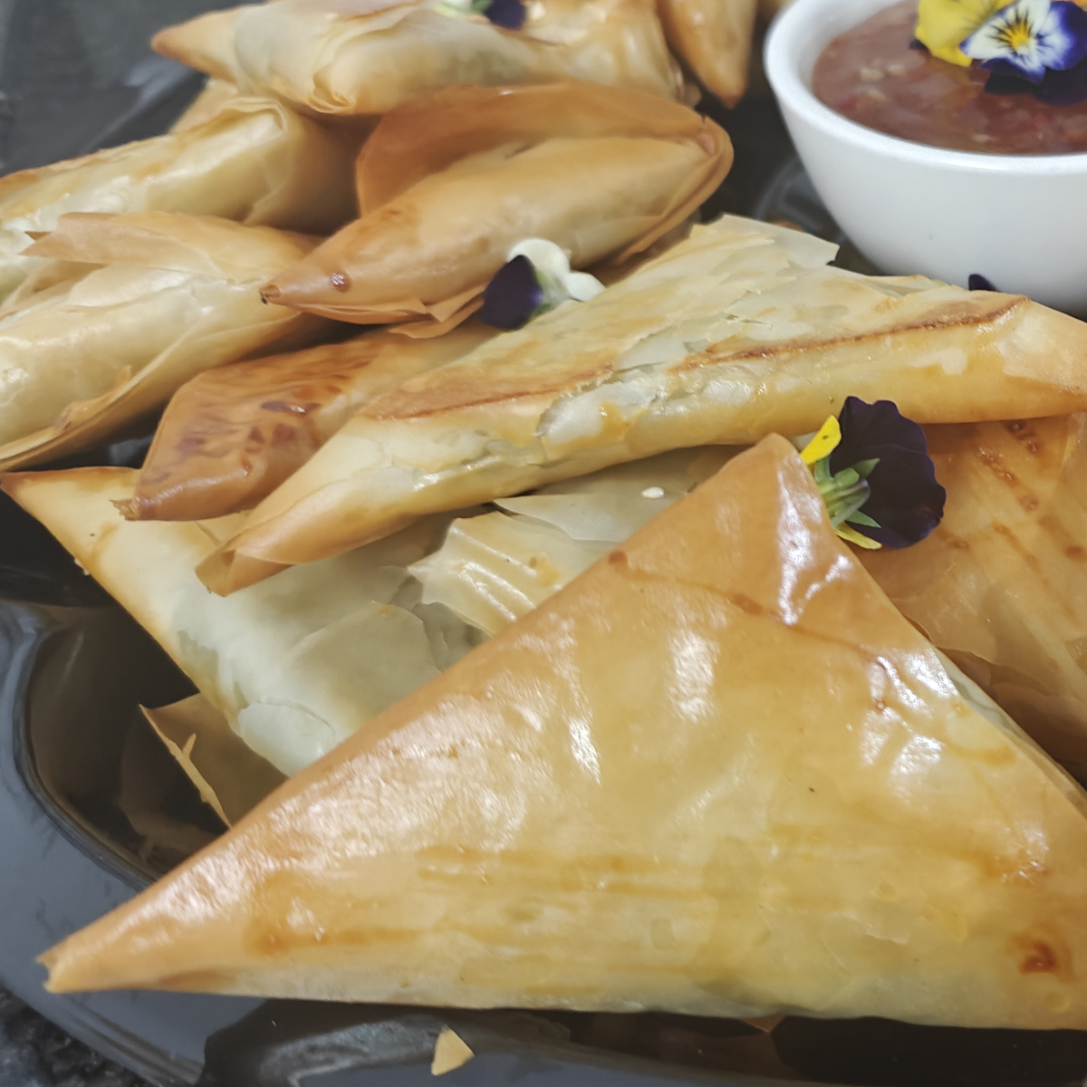 The platter is made up of traditional Greek pastries which include tiropites (cheese pies), spanakopites (spinach & feta pies), halloumoites (halloumi pies) and eliopites (olive pies).