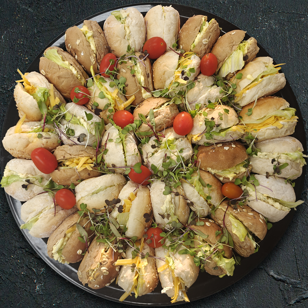 A selection of cocktail roll sandwiches with assorted fillings: cheese, chicken mayo and egg mayo.